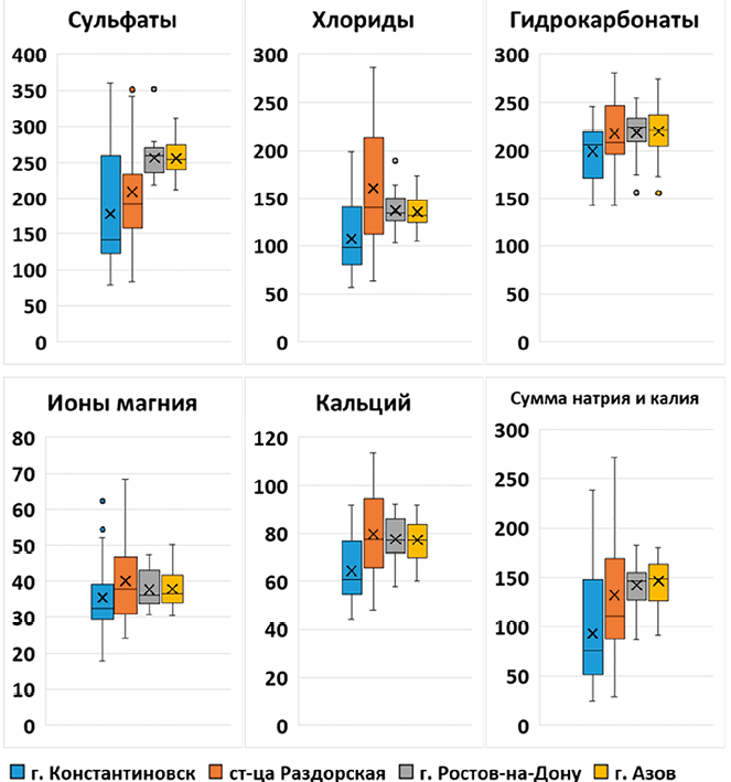 Рис. 2. Диаграммы размаха («ящики с усами») содержания главных ионов в воде нижнего течения р. Дон, мг/л Источник: составлено автором на основе используемых данных