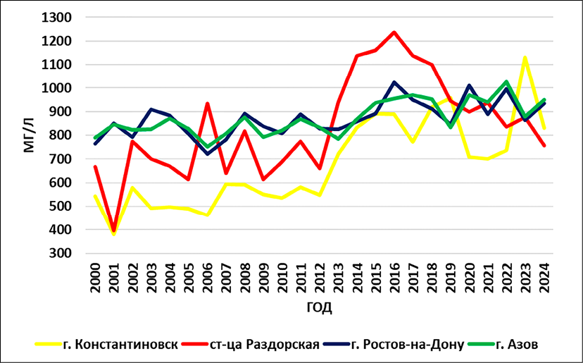 На рис. 3 представлен график, характеризующий содержание в воде нижнего течения р. Дон главных ионов (по сумме) по данным пунктов гидрохимических наблюдений за период с 2000 по 2024 г.