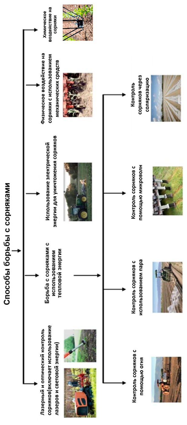 В условиях стремительной модернизации сельскохозяйственной отрасли актуальным и перспективным направлением является разработка агророботов, которые интегрируют интеллектуальные технологии прополки и распознавания растений; такие роботы предназначены для реализации принципов органического земледелия и позволят сельхозпредприятиям выпускать экологически чистую продукцию [12]. На рисунке представлены основные способы уничтожения сорняков с помощью интеллектуальных агророботов (все изображения находятся в открытом доступе) [13].