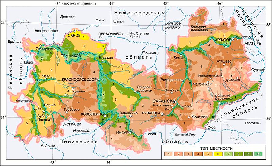 Республика Мордовия находится в центре Русской равнины, на северо-западных склонах Приволжской возвышенности, которая на западе республики переходит в Окско-Донскую низменность. Наиболее возвышенным является междуречье Алатыря и Суры, где абсолютные отметки достигают 334 м, снижаясь в поймах рек до 89–115 м. Приволжская возвышенность отличается доминированием геосистем северной лесостепи на эрозионно-денудационных и вторичных моренных равнинах. На Окско-Донской низменности преобладают лесные типы геосистем на водно-ледниковых равнинах с широкими речными долинами. Абсолютные отметки варьируют от 170 до 215 м, а в долинах они снижаются до 90 м [1, с. 6]. Для региона характерно отчетливое проявление склоновой смены геосистем (рис. 1).