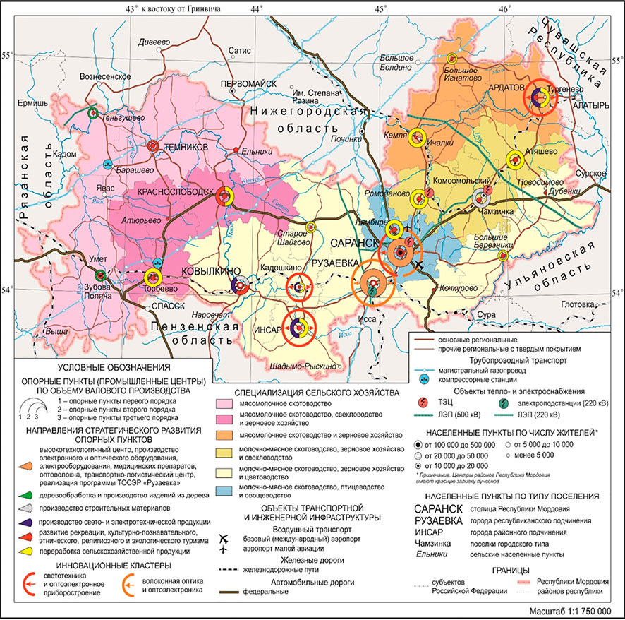 Рис. 3. Опорный хозяйственный каркас Республики Мордовия и стратегические оси развития территории Примечание: составлен автором на основе источника [2]