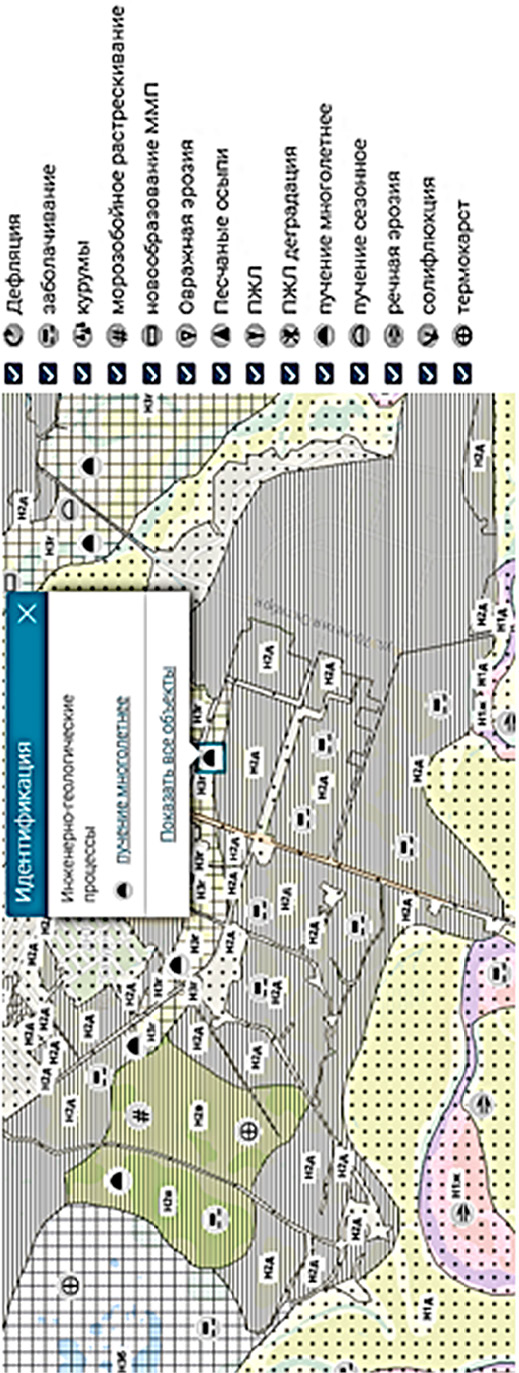 Зоны опасных геоэкологических процессов выделяются автором посредством анализа результатов мониторинга УНГКМ и материалов ДЗЗ. Исследованию подверглись геодинамические, геокриологические процессы, загрязнение атмосферного воздуха, в том числе эмиссия ПГ, а также загрязнения нефтью и нефтепродуктами почвы и водоемов территории. Указанный подход реализован в результате применения возможностей опытного образца цифровой платформы геоэкологического мониторинга «АГИР-ТМ» и геопортала «Геоинфориск», разработанного на кафедре геоэкологии РГУ нефти и газа (НИУ) имени И. М. Губкина. Данная ГИС позволяет осуществить картографическое моделирование на основе идентификации источников опасных геоэкологических процессов [11]. В состав опытного образца входят модули: Raster Map, Vector Map, 3-D Map, Photo, Object Edit, Store House, Math, обеспечивающие построение моделей территории и объектно ориентированных моделей геоэкологического мониторинга. Геопортал предоставил возможность отображения геопространственной Базы данных в виде моделей УНГКМ на различных подложках [11]. Пространственная информация рассматривается в виде логической многослойной модели картографической системы, содержащей слои по каждому выделяемому компоненту. Слои могут накладываться один на другой. Каждый слой имеет самостоятельное значение и может быть выведен на экран отдельной аналитической картой. Дополнительные пояснения по каждой отметке содержатся в атрибутивных полях, соответствующих специфике информации.