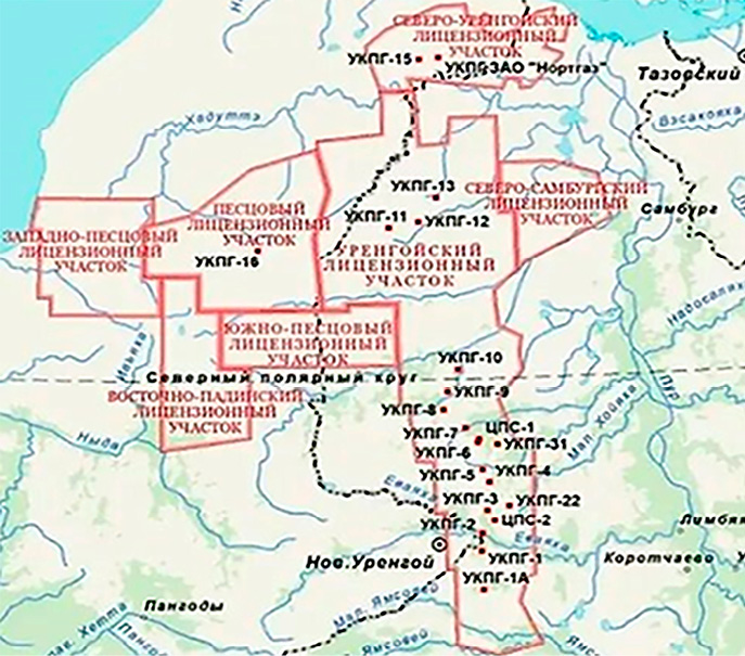 а) Расположение УНГКМ относительно Северного полярного круга [10]