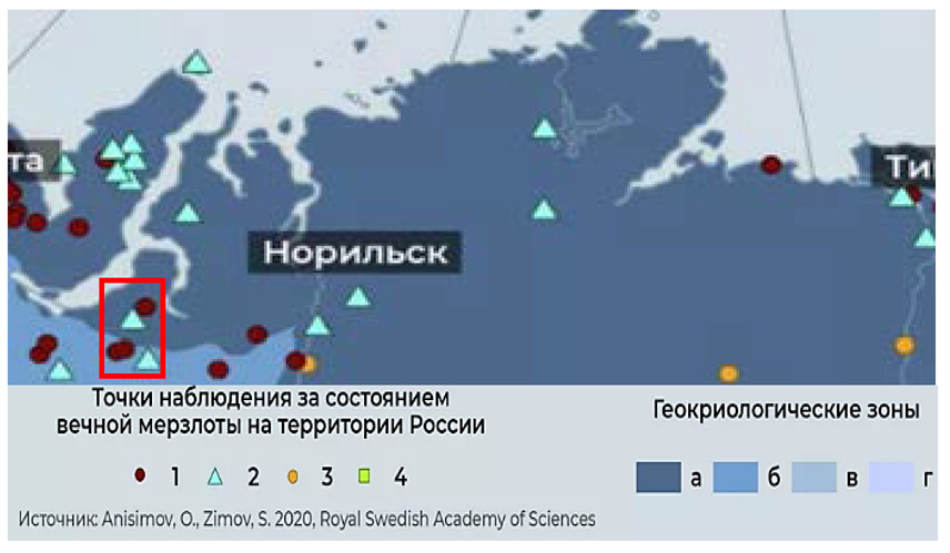 б) Фрагмент карты точек наблюдения за состоянием вечной мерзлоты на территории России Примечание: составлено по данным: Не упустить момент. Ученые призывают взять под контроль вечную мерзлоту 05.03.2022 URL: https://ria.ru/20220305/merzlota-1775890813.html (дата обращения: 18.12.2025)