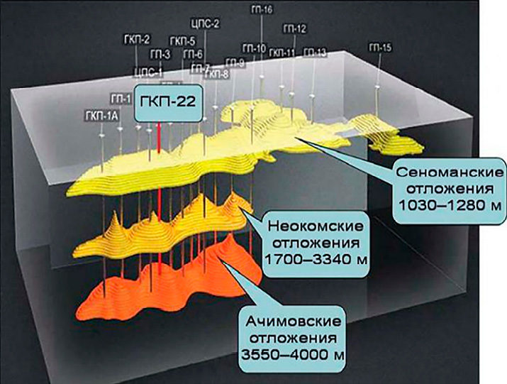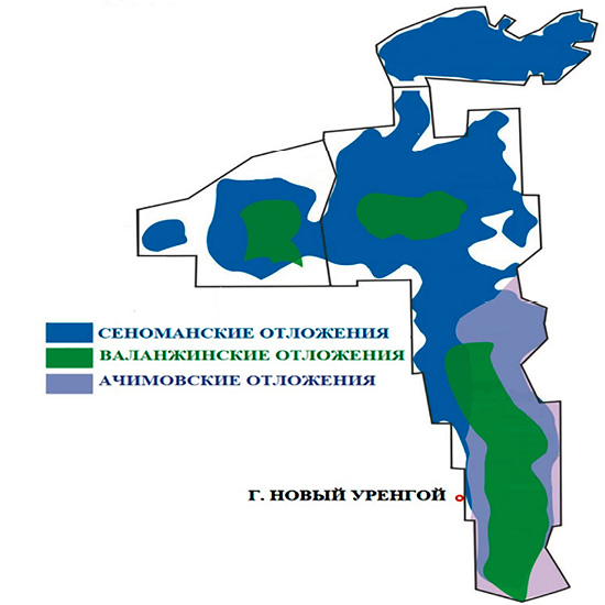 - разработка одновременно 3 типов залежей (сеноманских, валанжинских и ачимовских) с различными геологическими условиями и периодами разработки (рис. 2 в, г);