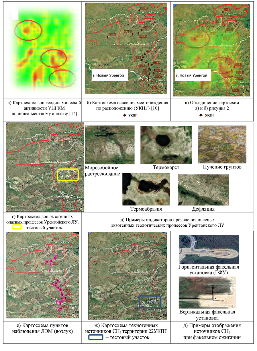Развитие систем дистанционного зондирования Земли (ДЗЗ) и геоинформационных технологий обуславливают возможность их применения для обеспечения комплексных геоэкологических наблюдений. Для выделения зон опасных геоэкологических процессов были использованы методы ДЗЗ, обеспечивающие контроль геодинамических, геокриологических процессов, загрязнения атмосферного воздуха, в том числе эмиссии ПГ, а также загрязнения нефтью и нефтепродуктами почвы и водоемов территории нефтегазопромыслов.