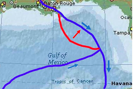 Рис. 1. Подводный склон в Мексиканском заливе (оконтуренный cиней (транзитный тальвег) и красной (предел действия склона) линиями, с двумя ортогональными координатами наклона, показанными синей и красной стрелками), где 20 апреля 2010 г. произошла авария Примечание: составлен автором по результатам данного исследования с использованием источников [14; 15; 17]