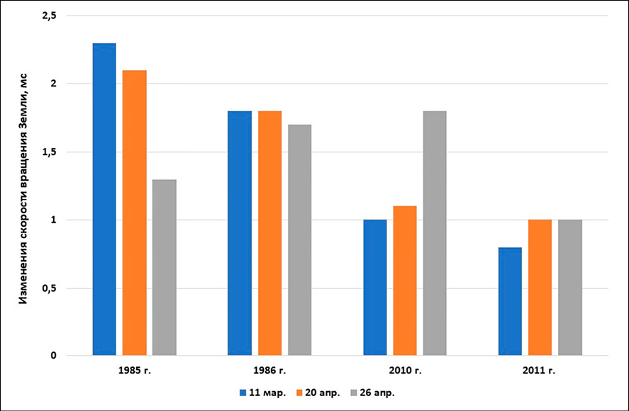 Рис. 2. Изменения замедления вращения Земли 11 марта, 20 апреля, 26 апреля в 1985, 1986, 2010, 2011 гг. Примечание: составлен автором по результатам данного исследования с использованием источника [21]