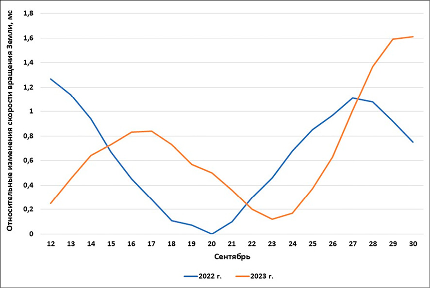 Как видно из рис. 3, в целом депрессия 2022 г. была относительно более глубокой, чем подобная ей 2023 г. Наклон отмеченных депрессий изменился. С 15 по 22 сентября 2023 г. скорости вращения Земли существенно меньше тех, которые были зафиксированы в эти даты в предыдущем 2022 г.