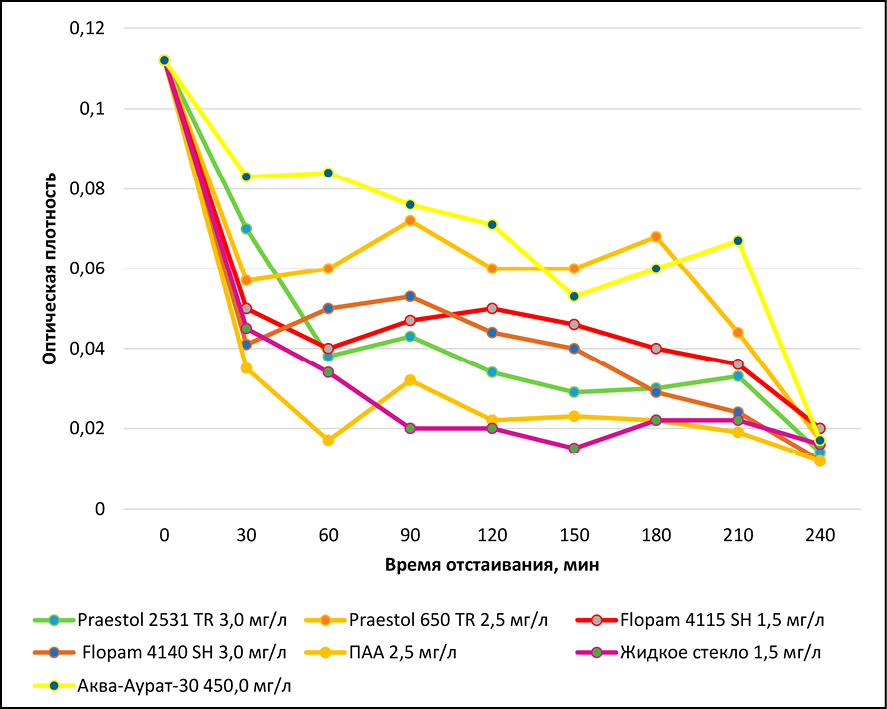 Рис. 2. Зависимость оптической плотности воды от времени отстаивания в присутствии различных флокулянтов в оптимальных дозах Примечание: составлен автором по результатам данного исследования