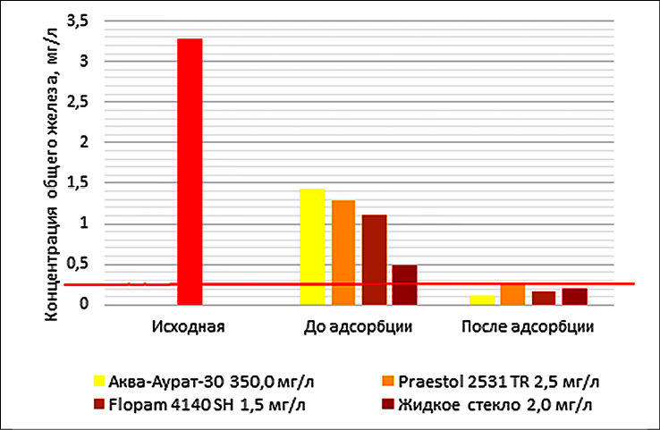 Рис. 3. Величины концентраций общего железа в пробах после коагуляционно-флокуляционной обработки до и после адсорбции Примечание: составлен автором по результатам данного исследования