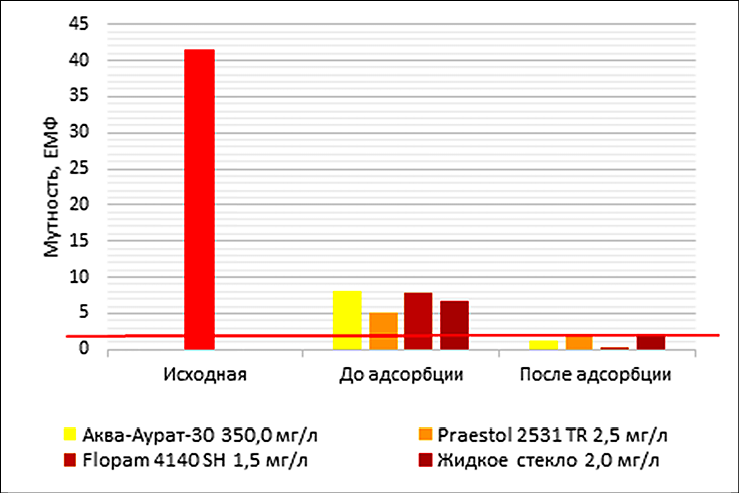 По степени уменьшения мутности воды высокие результаты также показали следующие реагенты: Аква-Аурат 30 (350 мг/л), Flopam 4140 SH (1,5 мг/л), Praestol 2531 TR 2,5 мг/л), жидкое стекло (2,0 мг/л) после коагуляционно-флокуляционной обработки с последующей сорбционной доочисткой.