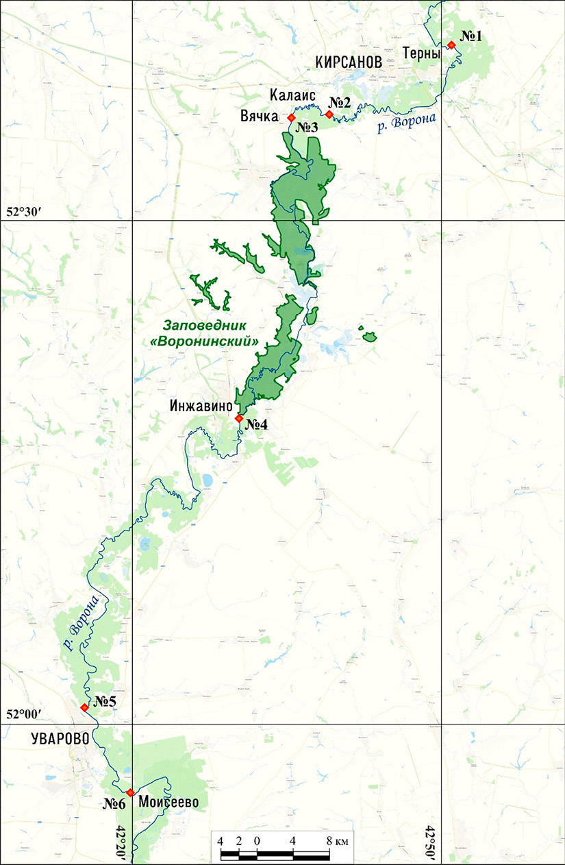 Материалом для исследования стали пробы воды поверхностного слоя (0–20 см) р. Вороны, отобранные у г. Кирсанова, заповедника «Воронинский» и г. Уварово.