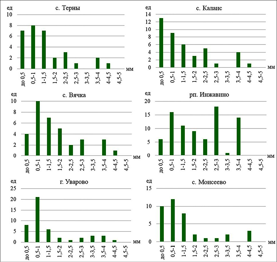 Лишь створ «Инжавино» выбивается из общей тенденции. Здесь максимальное количество частиц микропластика сосредоточено в диапазоне до 2,5 мм, и это всего 52 % от общего числа частиц. Помимо этого значимое количество микропластиковых частиц относятся к диапазонам 2,5–3 и 3,5–4 мм.