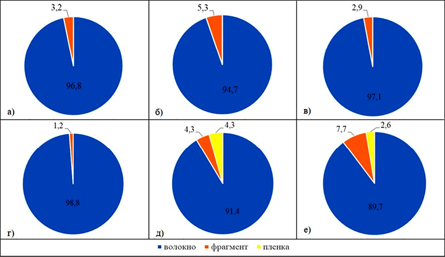 Рис. 3. Процентное соотношение частиц микропластика в пробах воды в зависимости от вида частиц: а) с. Терны, б) с. Калаис, в) с. Вячка, г) р. п. Инжавино, д) г. Уварово, е) с. Моисеево Примечание: составлен авторами по результатам исследования