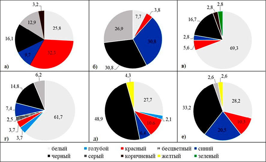 Рис. 4. Процентное соотношение частиц микропластика в пробах воды в зависимости от цвета частиц: а) с. Терны, б) с. Калаис, в) с. Вячка, г) р. п. Инжавино, д) г. Уварово, е) с. Моисеево Примечание: составлен авторами по результатам исследования
