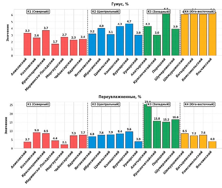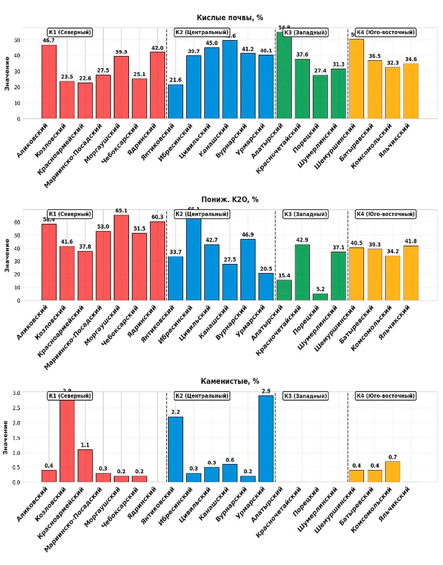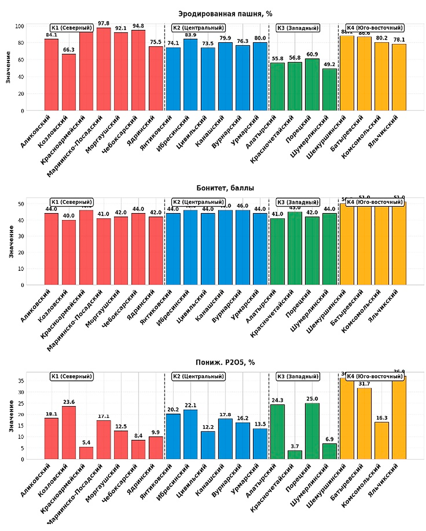 Методом иерархического кластерного анализа выделено четыре кластера Чувашской Республики, различающихся по комплексу геоэкологических показателей: Северный – зона критической деградации (критическая эрозия и дефицит калия); Центральный – зона эрозионного риска (средние показатели с повышенной кислотностью и каменистостью); Западный – зона переувлажнения (минимальная эрозия, но максимальное переувлажнение и кислотность); Юго-Восточный – зона высокого потенциального плодородия (высокий природный потенциал при дефиците фосфора и калия).