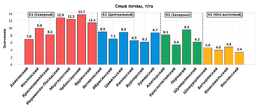 Наиболее критическая ситуация наблюдается в районах с высокой густотой овражно-балочной сети (> 2 км/км²), таких как Чебоксарский, Ядринский и Канашский. Среднегодовой смыв почвы по республике составляет 8,00 т/га, что превышает допустимые нормы для устойчивого земледелия (2–5 т/га). Максимальные значения зафиксированы в Чебоксарском (13,73 т/га) и Мариинско-Посадском (12,88 т/га) районах.