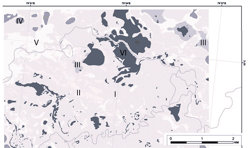 Рис. 3. Геоморфологическая схема ключевого участка, расположенного западнее оз. Топольного (1:50 000). Элементы рельефа: I – склоны водораздельных поверхностей; II – приподнятые стокоформирующие водораздельные поверхности; III – сезонно переменные ложбины стока, осложненные суффозионными западинами и озерными котловинами; IV – аккумулирующие суффозионные западины с озерами; V – ложбины стока; VI – автономные изолированные водораздельные поверхности Источник: составлено автором