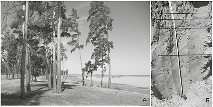 Рис. 4. Сосновый лес на эоловой гряде (А) и разрезы отложений межгрядового понижения (Б) в районе оз. Малинового Условные обозначения: А – фото оз. Малинового и эоловой гряды, покрытой сосновым лесом; Б – отложения межгрядового понижения с осоковым лугом: 1 – тонкозернистый песок с включениями корней (eolQ4); 2 – тонкозернистый песок (eolQ4); 3 – тонкозернистый песок с прослойками торфа и окиси железа (eol-h Q4); 4 – крупнозернистый песок (аl Q4); 5 – влажный крупнозернистый песок с косой слоистостью, пятнами и подтеками окиси железа (аl Q4) Источник: составлено автором