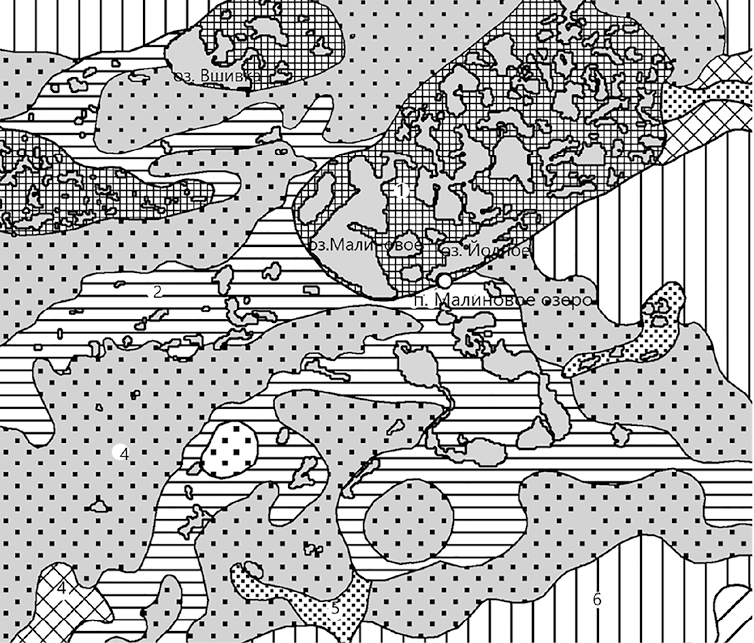 Рис. 5. Геоморфологическая схема территории, прилегающей к оз. Малиновому. Элементы рельефа: 1 – низкие озерные террасы; 2 – днища ложбин стока; 3 – террасовые поверхности ложбин стока, осложненные эоловыми грядами; 4 – останцы террасовых поверхностей; 5 – балки с долинами малых водотоков; 6 – высокие террасы ложбин стока; 7 – склоны ложбин стока Источник: составлено автором