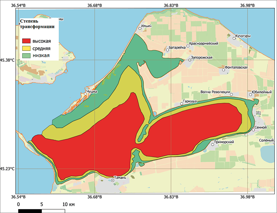 По результатам интегральной геоэкологической оценки макрофитобентосных сообществ Таманского залива, выполненной по комплексу показателей (сохранение доминирующего вида в ассоциациях, биомасса доминирующих ассоциаций), были выявлены три зоны с высокой (5 и более баллов), средней (3–4 балла) и низкой (2 балла) степенью проявления трансформационных процессов (рис. 1).