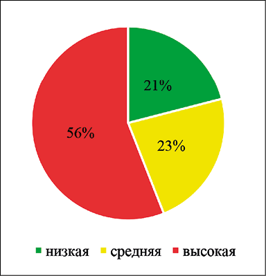 На долю с высоким проявлением трансформационных процессов в современный период приходится 56 % площади акватории, средним – 23 %, низким – 21 %, что показано на рис. 2.
