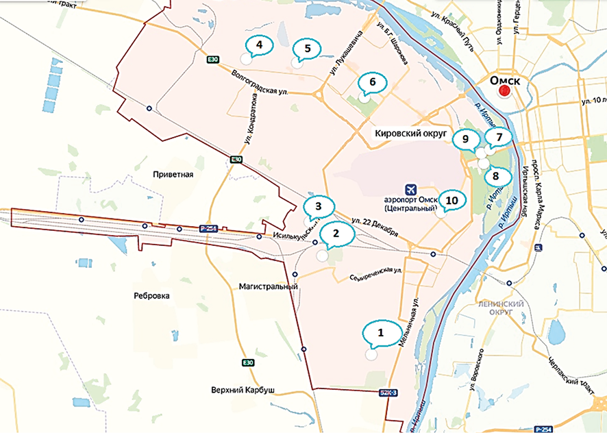 Локализация исследуемых водоемов на территории Кировского АО г. Омска: 1 – пруд в районе Новокировского кладбища; 2 – пруд у пельменной фабрики; 3 – пруд на территории СНТ «Нефтехимик»; 4 – пруд территории пос. Солнечный; 5 – пруд около ТЦ «АТ-Маркет»; 6 – оз. территории парка им. 300-летия г. Омска; 7, 9 – озёра территории ООПТ «Птичья гавань» (восточное и западное); 8 – оз. территории парка им. 30-летия Победы; 10 – оз. Кирпичка на территории Авиагородка Примечание: составлено автором с использованием: URL: https://2gis.ru/omsk?m=73.272367%2C54.945991%2F12.41