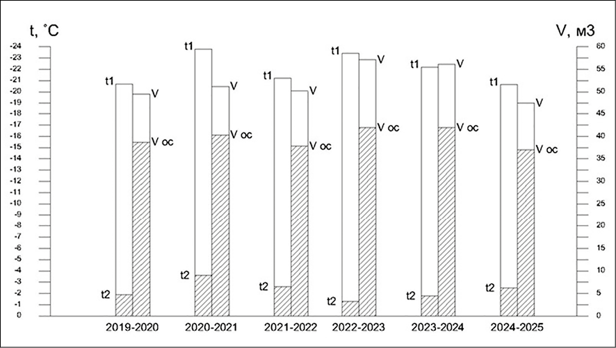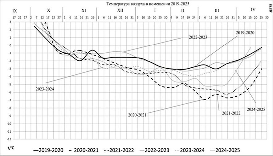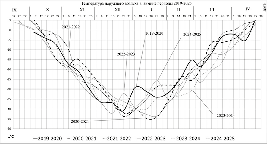 Потери тепла из помещения в окружающую среду определяли расчетным путем [12, с. 31; 13, c. 24; 14]. Испытания опытного объекта были проведены при различных среднезимних температурах наружного воздуха и разных количествах воды в обогревательных устройствах, названных водяными аккумуляторами тепла (ВАТ), в течение 2019–2025 гг. Зимние температуры наружного воздуха в разные годы до начала и в период испытания опытного объекта колебались в значительных пределах (табл. 1).