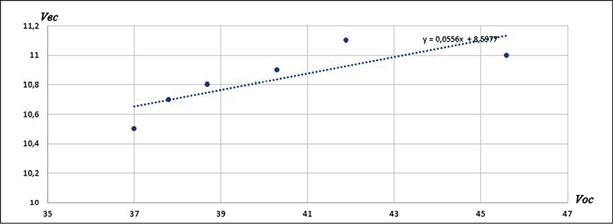 Зависимость Vвс, от Vос графически показана на рис. 4, которая выражается линейным уравнением
