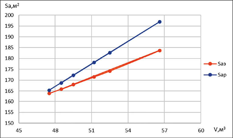 На рис. 6 представлены графики зависимости теплообменной поверхности экспериментального и предлагаемого аккумуляторов от объема воды.