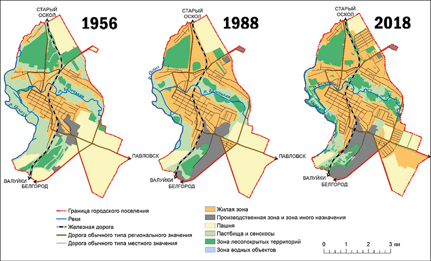 Рис. 1. Структурно-ландшафтное зонирование городского поселения «Город Новый Оскол» по данным на 1956, 1988 и 2018 гг. Примечание: составлен авторами на основе полученных данных в ходе исследования