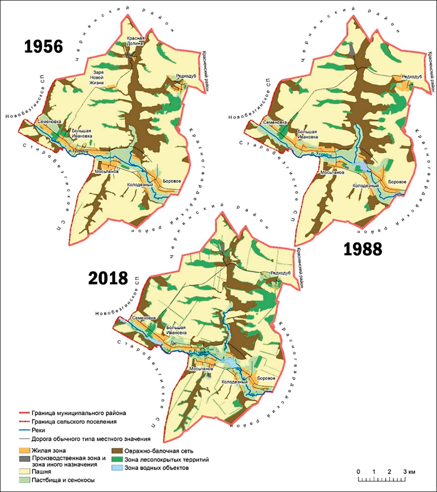 Рис. 2. Структурно-ландшафтное зонирование Большеивановской сельской территории по данным на 1956, 1988 и 2018 гг. Примечание: составлен авторами на основе полученных данных в ходе исследования