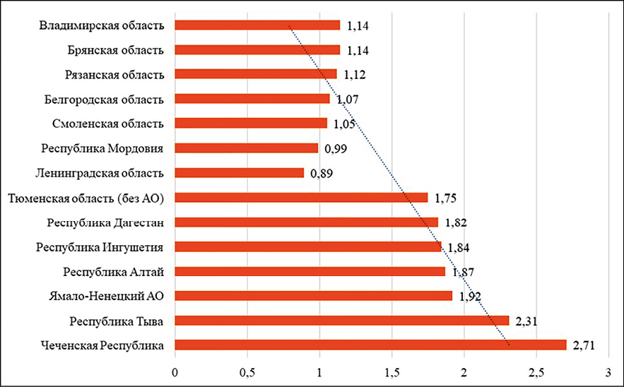 Внутри Центрального федерального округа (ЦФО) сохраняется резкая пространственная поляризация суммарного коэффициента рождаемости (СКР). Несмотря на относительную социально-экономическую однородность, демографическая ситуация в округе характеризуется глубоким разрывом между отдельными регионами. Это свидетельствует о том, что средние показатели по округу маскируют принципиально разные демографические реальности, а универсальные меры демографической политики не учитывают специфику территорий.