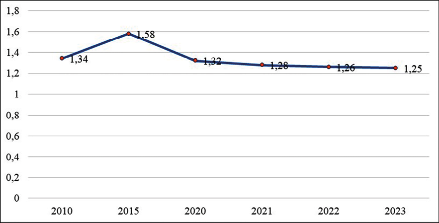 Анализ динамики рождаемости в ЦФО выявил устойчивую тенденцию к снижению после кратковременного роста в 2012-2015 годах. К 2023 году СКР в округе составил 1,25, что ниже среднероссийского показателя (1,41) и значительно ниже уровня, необходимого для простого воспроизводства населения (2,15).