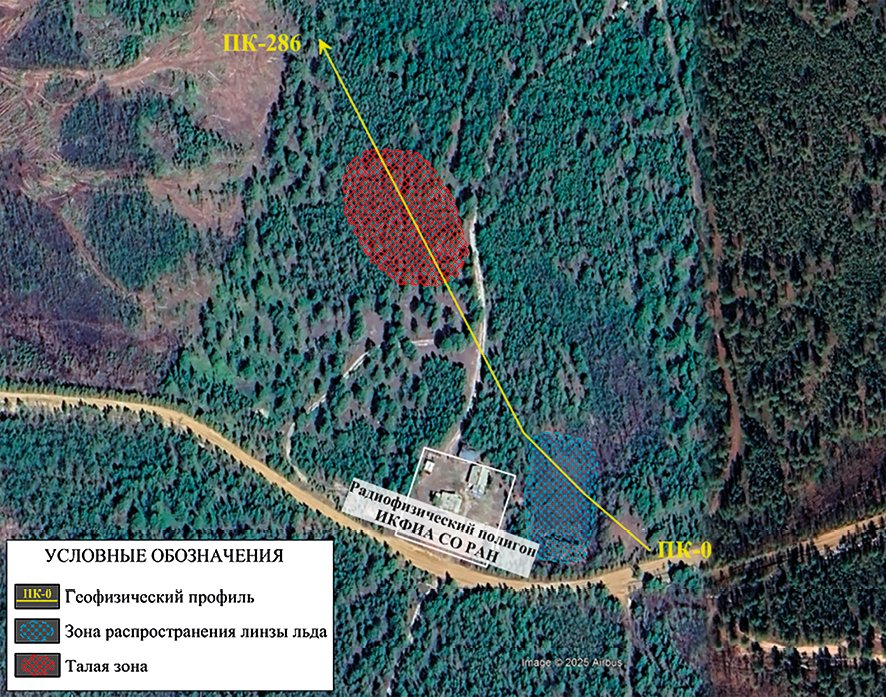 Рис. 1. Схема геофизического профиля Примечание: составлен авторами на основе аэрофотоснимка Google Earth и по результатам данного исследования