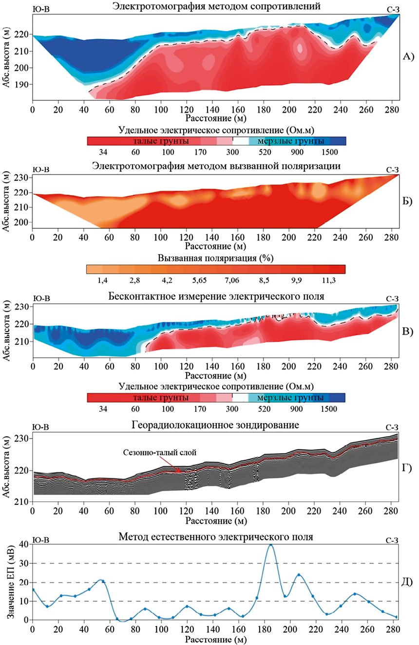 Проведенные исследования показали, что зоны с наличием мерзлых пород и линзы льда характеризуются высокими значениями УЭС (от 1000 Ом·м) при низких показаниях ВП (до 5 %), а таликовые зоны – низкими значениями УЭС (до 300 Ом·м) со значительно высокими ВП (9–15 %). Георадиолокационное зондирование позволило выявить границу слоя сезонного оттаивания, где на радарограмме с высоким контрастом отражаются зоны с наличием линзы льда и мерзлых пород. В интервале профиля 150–210 м граница сезонно-талого слоя выделяется в основном по прерывистым осям синфазности с переменной контрастностью, что объясняется слабыми отражениями или их отсутствием на границе подошвы сезонно-талого слоя и зоны талика. Метод измерения естественного электрического поля также показал результативность в представлении дополнительной информации о сквозной таликовой зоне в виде высоких значений потенциалов – 12,8–40 мВ. Таким образом, комплексный анализ данных электроразведочных исследований показал хорошую сопоставимость разных электрофизических свойств горных пород при оценке их криогенного состояния.