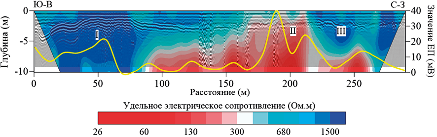 Полевые работы комплексом электроразведочных методов выполнены осенью при максимальной оттайке слоя сезонного промерзания и оттаивания. По результатам выполненных работ построены геоэлектрические разрезы методом сопротивлений и вызванной поляризации, георадиолокационный разрез и кривая потенциала естественного электрического поля (рис. 2). Процедуры обработки и инверсии данных электротомографии методом сопротивлений и вызванной поляризации, а также бесконтактного измерения электрического поля выполнены в ПО x2ipi (МГУ, А.А. Бобачев) и zondres2d (А.Е. Каминский), с последующим экспортом в формат ПО Golden Software Surfer.