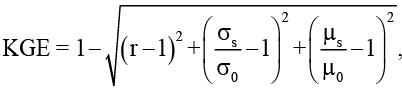 Критерий KGE комплексно учитывает динамику стока, в том числе временные сдвиги через корреляцию, изменчивость стока через отношения стандартов и смещение на уровне средних между наблюденными и моделированными расходами воды. Чем ближе KGE к единице, тем выше точность моделирования [14].