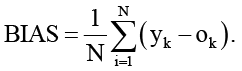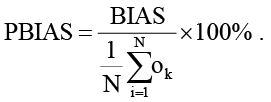 Кроме критериев NSE и KGE, для характеристики точности результатов моделирования стока рассматривается параметр BIAS (смещение/отклонение), который определяет среднее отклонение рассчитанных (моделируемых) yk от наблюденных ok значений (в нашем случае расходов воды):