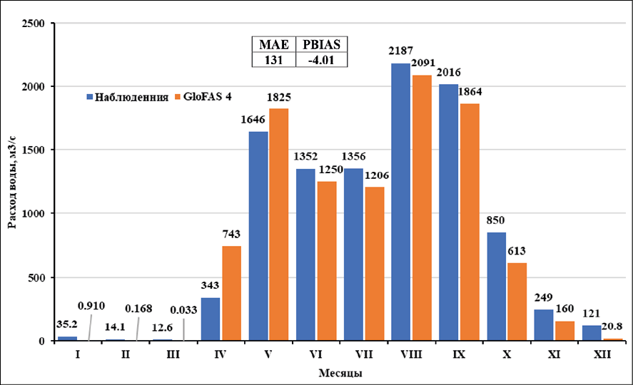 Среднее относительное отклонение рассчитанных месячных расходов воды от наблюденных (PBIAS) составляет -4,01%, т.е. сток несколько недооценивается. Абсолютная погрешность (MAE) составляет 131 м3/с (15,4% от среднемесячного стока). Наибольшее занижение рассчитанного стока по отношению к наблюденному стоку характерно для месяцев с низкой водностью (I–III и XII). В то же время рассчитанный сток в период половодья примерно на 117% выше наблюденного стока в апреле и на 10,9% – в мае (400 и 179 м3/с в абсолютном выражении).