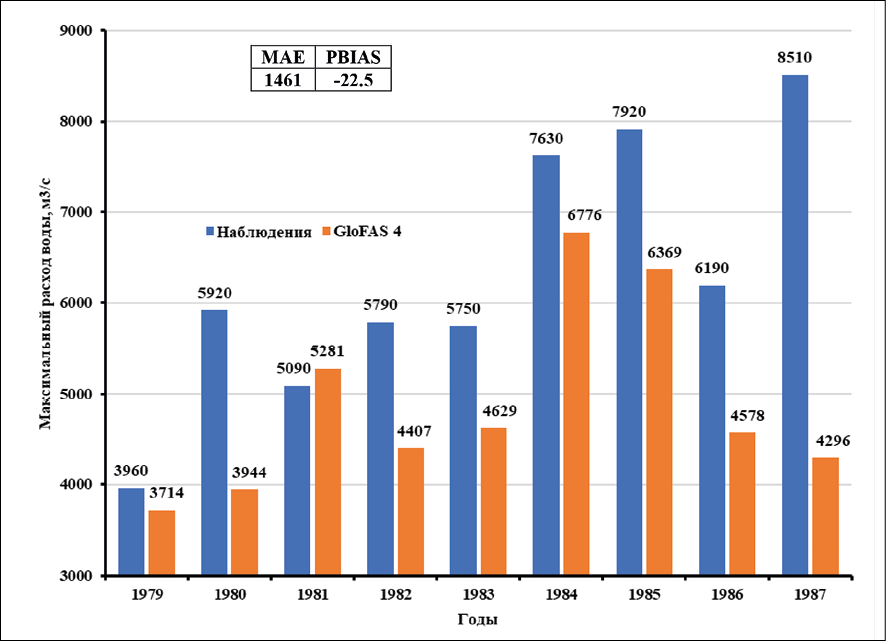 Среднее относительное отклонение PBIAS за рассматриваемый период составляет -22,5%, или 1461 м3/с в абсолютном выражении. Это в целом соответствует выводам, сделанным в работе [2], о занижении реанализом стока GloFAS–ERA5 в среднем на 20% максимального суточного дождевого стока для равнинных водосборов площадью более 2000 км2, что может говорить о системности ошибки и необходимости корректировки данных [15].