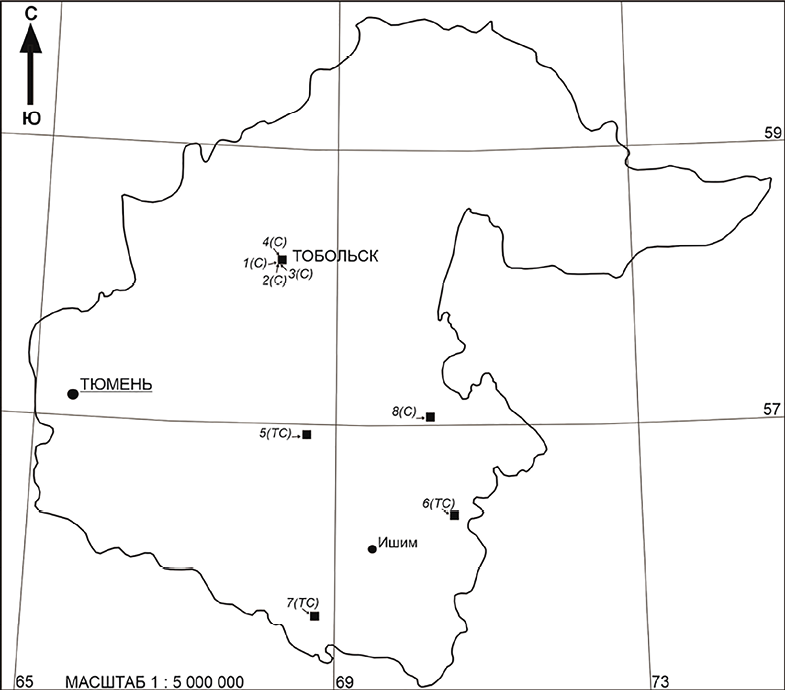 Рис. 1. Местоположение почвенных разрезов: 1 – памятник природы «Киселевская гора с Чувашским мысом»; 2, 3 – памятник природы «Окрестности дома отдыха “Тобольский”»; 4 – экологическая тропа в г. Тобольске; 5 – заказник «Алабуга»; 6 – заказник «Ереминский»; 7 – памятник природы «Озеро Соленое»; 8 – заказник «Викуловский». Буквами обозначен тип почвы: С – серая, ТС – темно-серая
