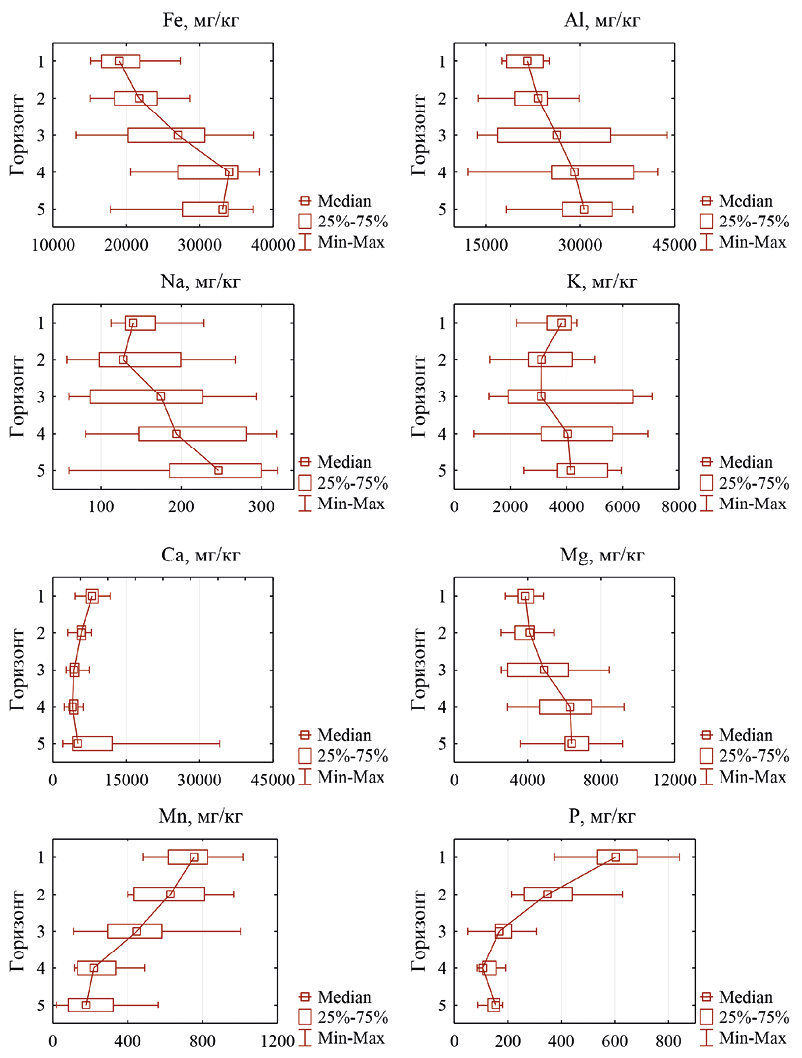 Судя по медианам, содержание Fe в горизонте ВT по отношению к горизонту АY(AU) составляет 157 %, а Al – 125 %. Выявленная аккумуляция согласуется с литературными данными [6, с. 81].