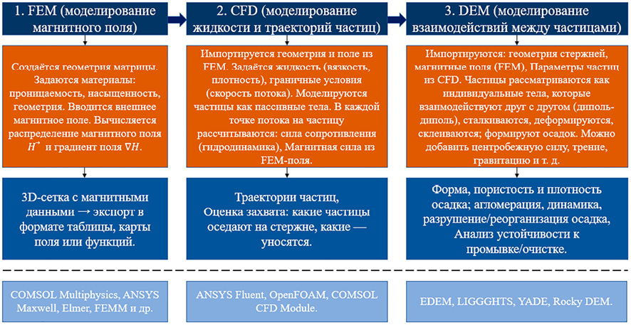 Представленный на рисунке алгоритм иллюстрирует интегрированный подход к численному моделированию процессов высокоградиентной магнитной сепарации, включающий три взаимосвязанных этапа. На первом этапе (FEM) проводится моделирование магнитного поля: создается геометрия матрицы, задаются физические свойства материалов и рассчитываются распределения магнитного потенциала и градиента поля. На втором этапе (CFD) моделируется движение жидкости и траектории частиц с учетом магнитных и гидродинамических сил, что позволяет определить зоны осаждения и оценить эффективность захвата. На третьем этапе (DEM) анализируются взаимодействия между частицами, формирование и разрушение агломератов, устойчивость и структура осадка. Такой комплексный подход обеспечивает детальное понимание взаимосвязей между магнитными, гидродинамическими и механическими процессами в зоне разделения и используется для оптимизации конструкции и режима работы ВГМС-систем.