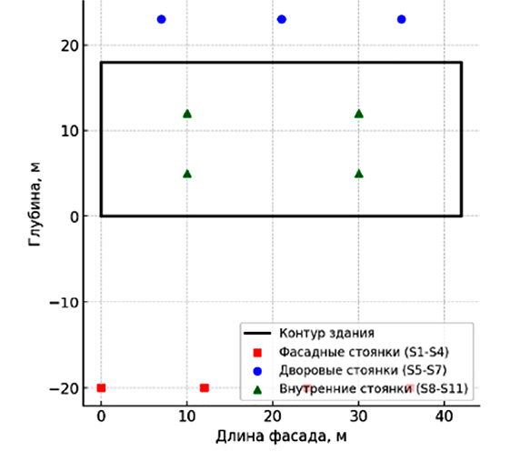 Фасад длиной 42 м и высотой 27 м покрывается при расстоянии сканирования R = 25 м. Чтобы обеспечить перекрытие не менее 40%, требуется не менее четырех стоянок на фасад (с базисом 12 м). Внутри двора достаточно трех стоянок на продольный ряд с перекрытием 30 %. Итого 7 стоянок для фасада и 4 для помещений, 11 стоянок. Схема размещения (рисунок) стоянок S1–S4 вдоль главного фасада через 12 м, S5–S7 во дворе, S8–S11 внутри помещений.